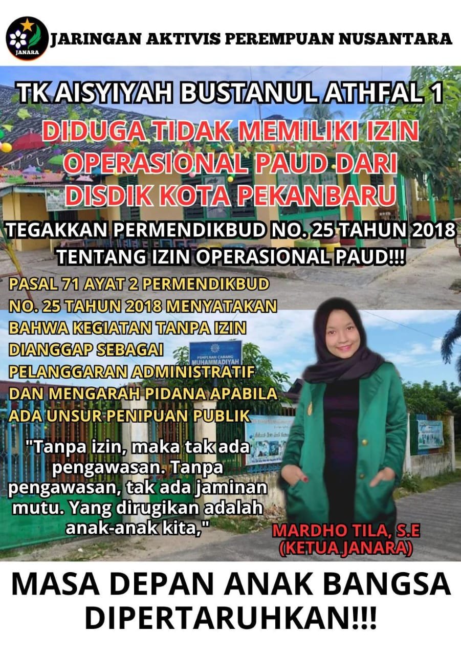 “Kami sudah menerima laporan dari warga. Jika memang benar belum memiliki izin, maka hal ini tidak bisa dibiarkan. Pendidikan anak usia dini harus diatur dan diawasi secara ketat,” ungkap Mardho Tila, S.E selaku Ketua Umum Jaringan Aktivis Perempuan Nusantara (JANARA).